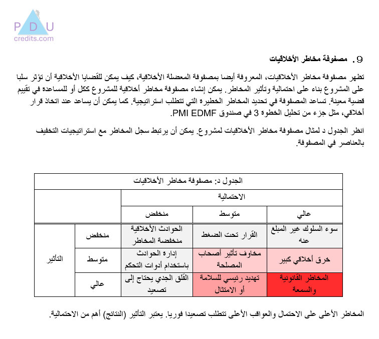 تستعرض هذه الدورة الأخلاقيات المهنية كما تنطبق على إدارة المشاريع. تشمل المعايير التي يتم تناولها: مدونة الأخلاقيات والسلوك المهني لـ PMI، مدونة الأخلاقيات لـ CPI، وإطار اتخاذ القرارات الأخلاقية لـ PMI. تتضمن أفضل الممارسات لمعالجة التحديات الأخلاقية الشائعة للمشاريع.