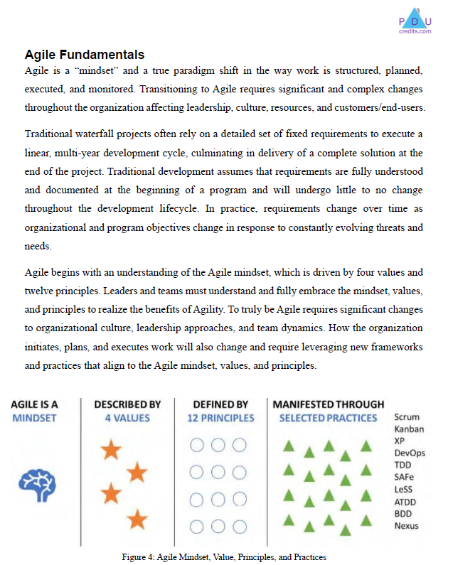 This course covers Agile values, principles, frameworks, and roles as it applies to project management. Agile is compared and contrasted with traditional waterfall approaches. The relation between Agile and Lean Manufacturing is covered. DevSecOps practices are covered, which integrates security features early in the design for a the software development lifecycle (SDLC). Scrum processes are covered in detail, including example applications.